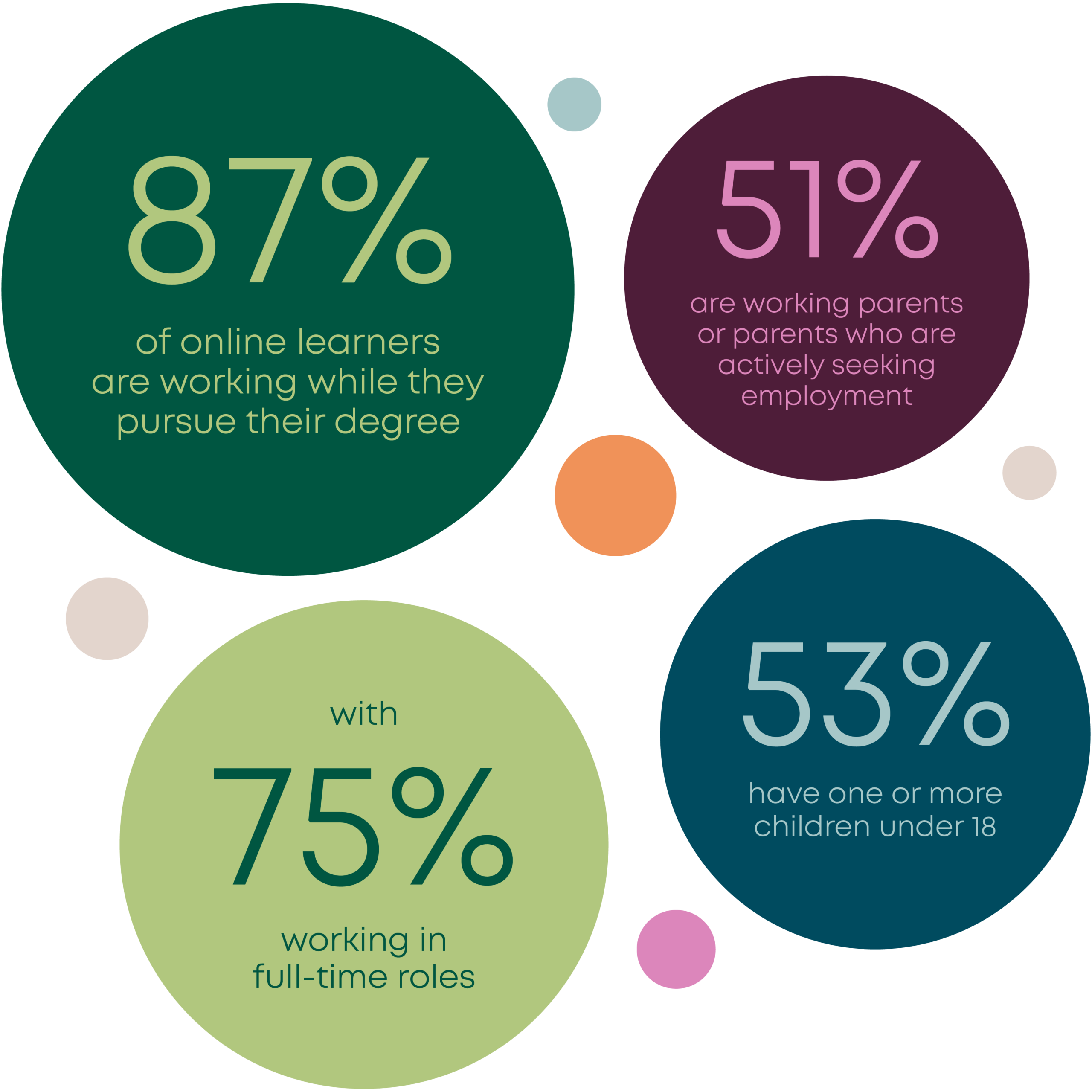 Data shows that online learners are adults who balance their studies with full- or part-time work, care giving, and personal obligations. A closer examination of online learners reveals an even busier and more inspiring learner profile, with over half of students being working parents or parents who are actively seeking employment.