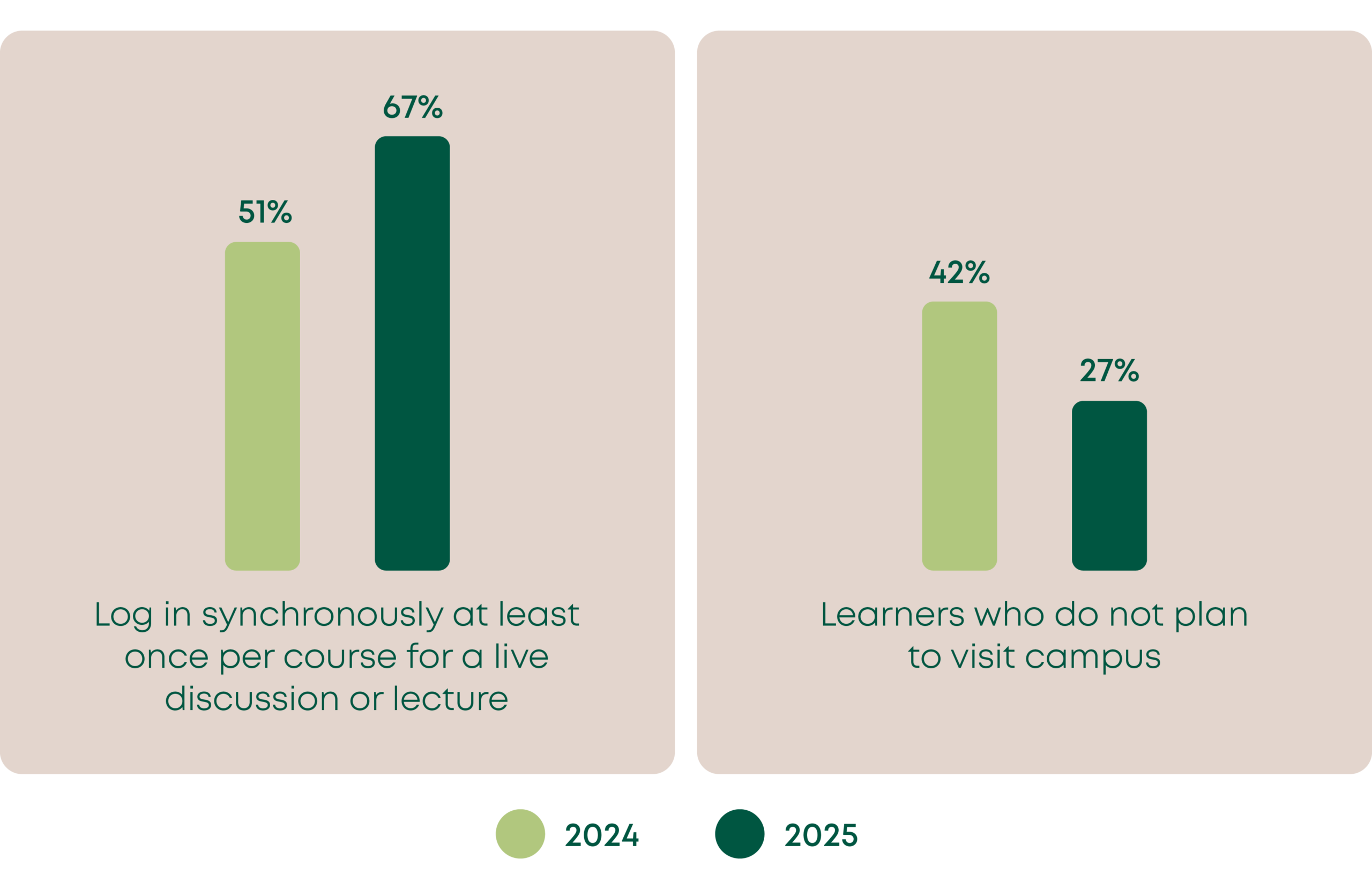 While online learners need and prioritize flexibility in their courses, a growing number actually crave a networked higher education experience with occasional in-person touch points. In fact, 67% of online learners reported that they want to log in synchronously at least once per course for a live discussion or lecture –a sharp rise from the 51% who wanted to do so last year. And, while a 2024 survey revealed that 42% of learners didn’t plan to visit campus, only around a quarter (27%) agreed with that statement this year, meaning 73% of online learners want or plan to visit their campus at some point, either for academic support or for special events like graduation.